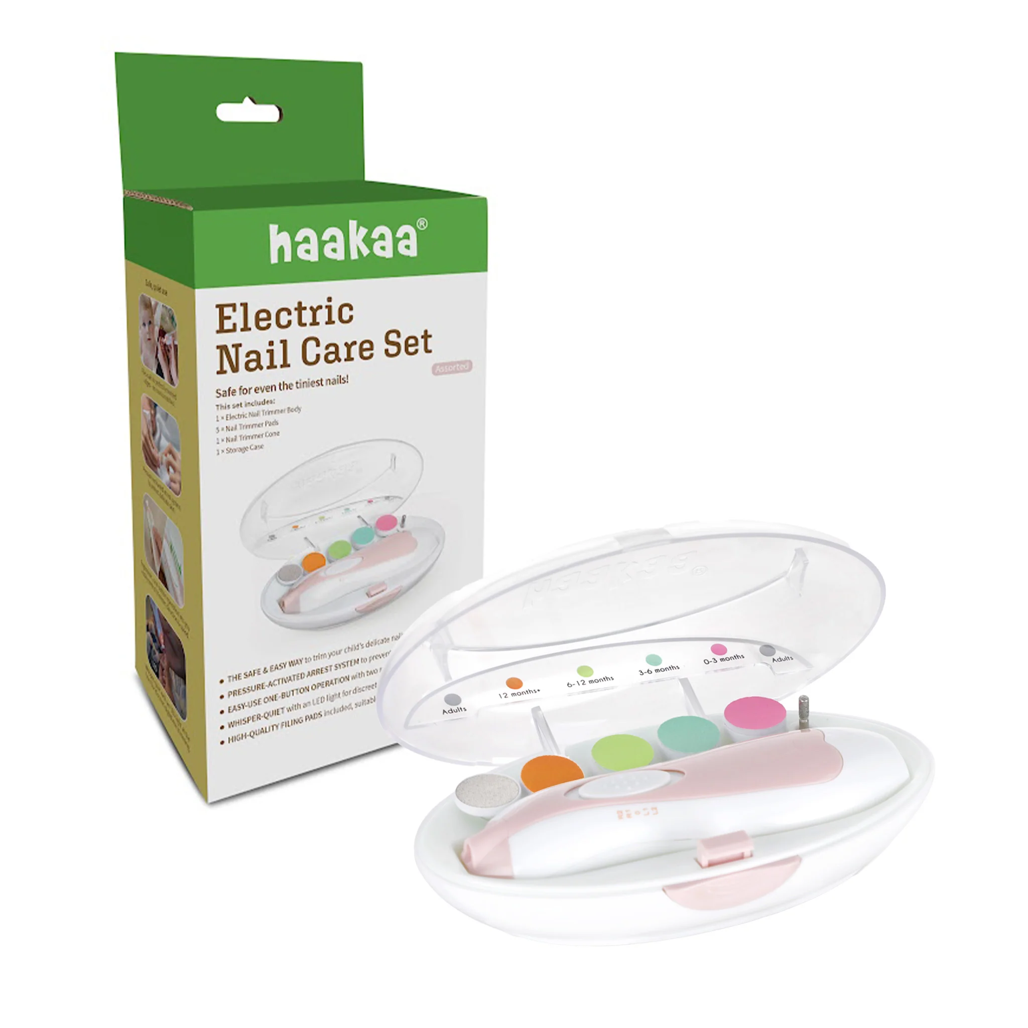 Simply attach the trimmer pad suitable for your child's age and gradually file down their nails! The trimmer pads make your baby's nails smooth and don't leave sharp edges that may scratch their delicate skin. We've also included a metal pad and cone so parents can file down their nails too!